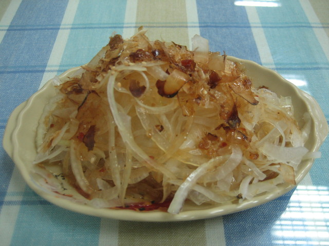 涼拌洋蔥味道很清爽很特別!使用柴魚片及日式調味料做出,微微的酸甜味,