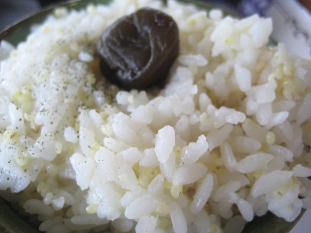 這是養生飯,上面撒了一點海苔,滿香滿好吃的,上面還放了一顆梅子做點綴。