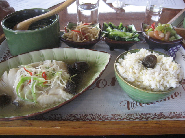 整套清蒸梅汁鱈魚簡餐的擺盤。